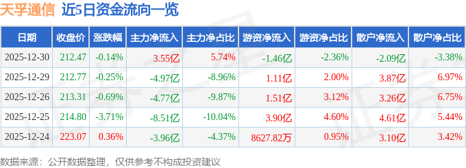 证券之星消息,截至2025年12月30日收盘,天孚通信(300394)报收于212.47元,下跌0.14%,换手率3.75%,成交量29.1万手,成交额61.9亿元。