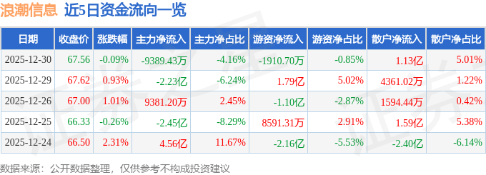 证券之星消息,截至2025年12月30日收盘,浪潮信息(000977)报收于67.56元,下跌0.09%,换手率2.28%,成交量33.44万手,成交额22.56亿元。