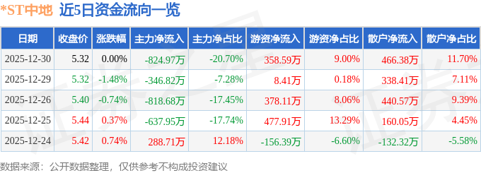 证券之星消息,截至2025年12月30日收盘,*ST中地(000736)报收于5.32元,上涨0.0%,换手率1.04%,成交量7.53万手,成交额3985.26万元。