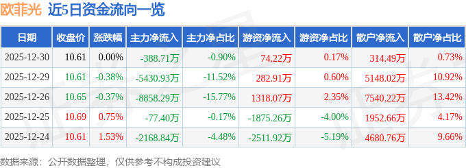 证券之星消息,截至2025年12月30日收盘,欧菲光(002456)报收于10.61元,上涨0.0%,换手率1.22%,成交量40.51万手,成交额4.31亿元。