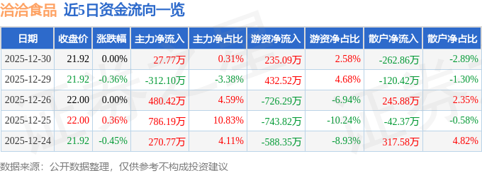证券之星消息,截至2025年12月30日收盘,洽洽食品(002557)报收于21.92元,上涨0.0%,换手率0.82%,成交量4.14万手,成交额9095.83万元。