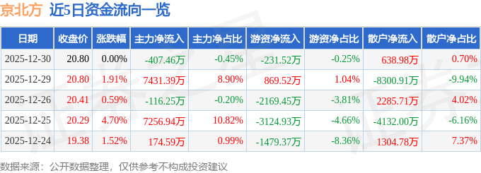 证券之星消息,截至2025年12月30日收盘,京北方(002987)报收于20.8元,上涨0.0%,换手率5.09%,成交量42.93万手,成交额9.1亿元。