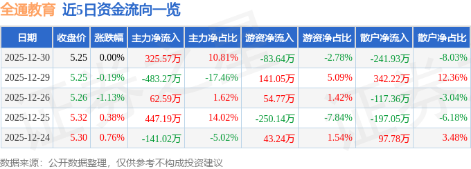 证券之星消息,截至2025年12月30日收盘,全通教育(300359)报收于5.25元,上涨0.0%,换手率0.91%,成交量5.74万手,成交额3011.3万元。