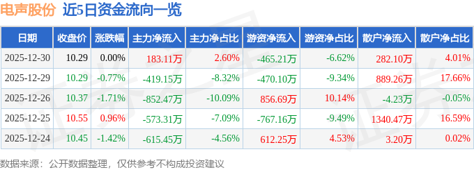 12月30日的资金流向数据方面,主力资金净流入183.11万元,占总成交额2.6%,游资资金净流出465.21万元,占总成交额6.62%,散户资金净流入282.1万元,占总成交额4.01%。