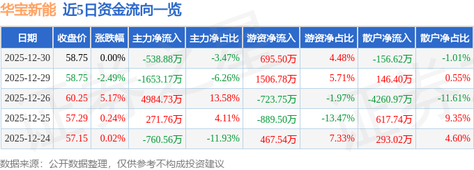 证券之星消息,截至2025年12月30日收盘,华宝新能(301327)报收于58.75元,上涨0.0%,换手率3.48%,成交量2.65万手,成交额1.55亿元。