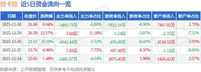 证券之星消息,截至2025年12月30日收盘,拉卡拉(300773)报收于26.6元,上涨0.04%,换手率21.51%,成交量157.98万手,成交额43.53亿元。