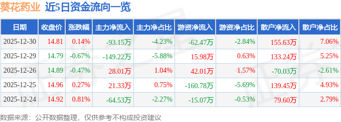 证券之星消息,截至2025年12月30日收盘,葵花药业(002737)报收于14.81元,上涨0.14%,换手率0.25%,成交量1.49万手,成交额2203.2万元。