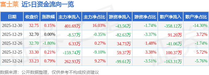 证券之星消息,截至2025年12月30日收盘,富士莱(301258)报收于32.75元,上涨0.15%,换手率0.87%,成交量7706.0手,成交额2505.07万元。