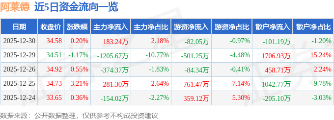 证券之星消息,截至2025年12月30日收盘,阿莱德(301419)报收于34.58元,上涨0.2%,换手率5.73%,成交量2.43万手,成交额8423.28万元。