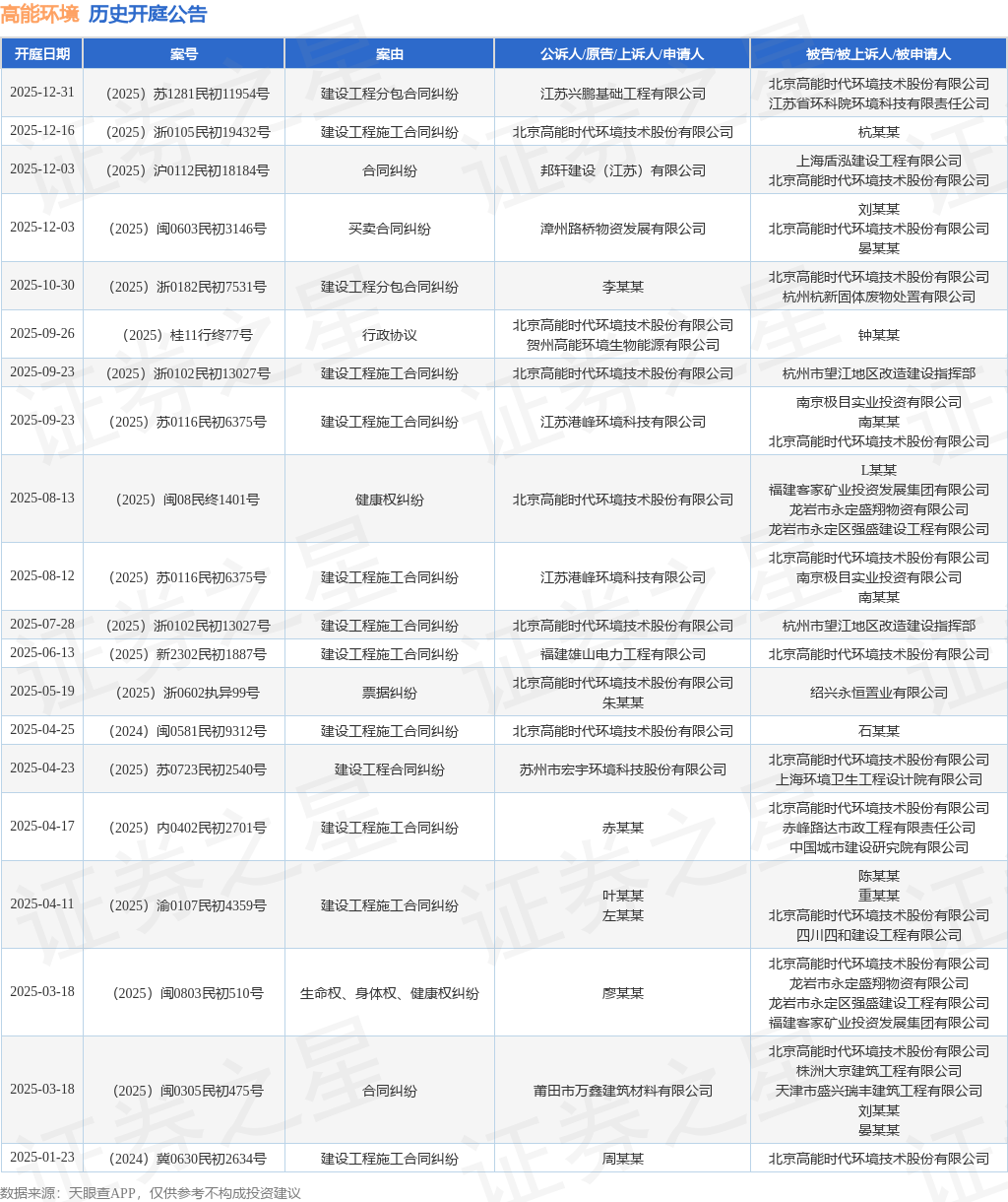 案号:(2025)苏1281民初11954号根据统计,近一年内以北京高能时代环境技术股份有限公司为当事人的历史开庭公告有23则,其中案由为“建设工程施工合同纠纷”的公告以12则居首,其次为“合同纠纷”有2则,“建设工程分包合同纠纷”有2则。历史开庭公告(前20条)如下: