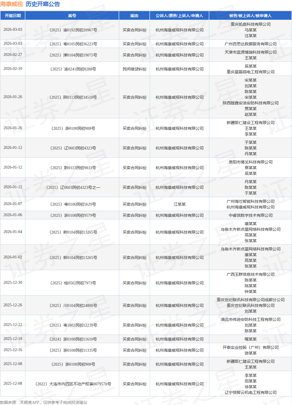 案号:(2025)新0104民初13265号根据统计,近一年内以杭州海康威视科技有限公司为当事人的历史开庭公告有166则,其中案由为“买卖合同纠纷”的公告以132则居首,其次为“债权人撤销权纠纷”有8则,“股东损害公司债权人利益责任纠纷”有8则。历史开庭公告(前20条)如下: