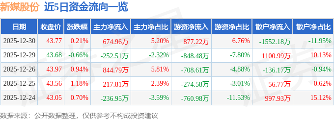 证券之星消息,截至2025年12月30日收盘,新媒股份(300770)报收于43.77元,上涨0.21%,换手率1.3%,成交量2.97万手,成交额1.3亿元。
