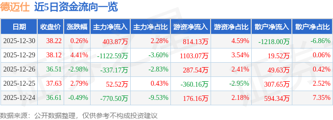 证券之星消息,截至2025年12月30日收盘,德迈仕(301007)报收于38.22元,上涨0.26%,换手率3.03%,成交量4.64万手,成交额1.77亿元。