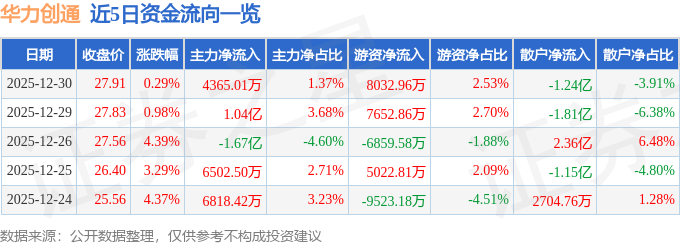 证券之星消息,截至2025年12月30日收盘,华力创通(300045)报收于27.91元,上涨0.29%,换手率22.05%,成交量113.82万手,成交额31.75亿元。