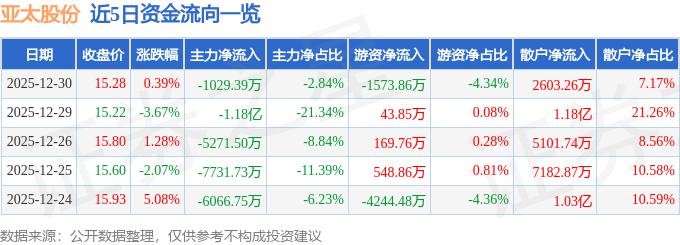 证券之星消息,截至2025年12月30日收盘,亚太股份(002284)报收于15.28元,上涨0.39%,换手率3.27%,成交量23.88万手,成交额3.63亿元。