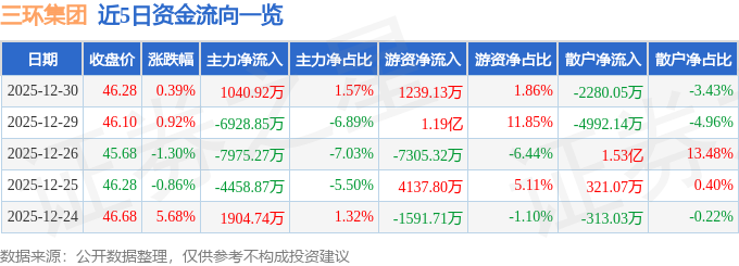 证券之星消息,截至2025年12月30日收盘,三环集团(300408)报收于46.28元,上涨0.39%,换手率0.77%,成交量14.31万手,成交额6.65亿元。