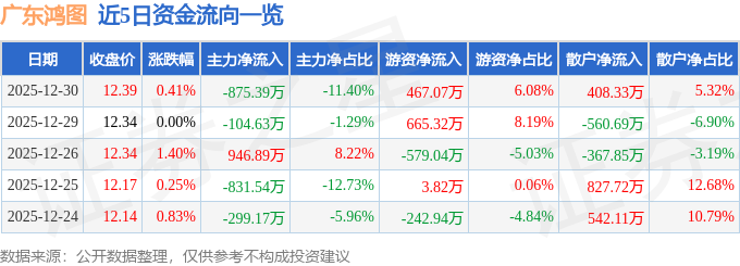 证券之星消息,截至2025年12月30日收盘,广东鸿图(002101)报收于12.39元,上涨0.41%,换手率0.94%,成交量6.21万手,成交额7675.78万元。