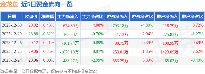 证券之星消息,截至2025年12月30日收盘,金龙鱼(300999)报收于29.02元,上涨0.48%,换手率1.05%,成交量5.7万手,成交额1.65亿元。