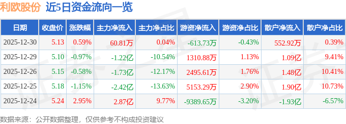 证券之星消息,截至2025年12月30日收盘,利欧股份(002131)报收于5.13元,上涨0.59%,换手率4.72%,成交量276.12万手,成交额14.23亿元。