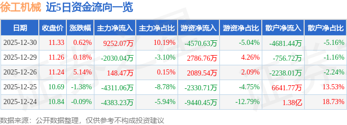 证券之星消息,截至2025年12月30日收盘,徐工机械(000425)报收于11.33元,上涨0.62%,换手率0.86%,成交量79.64万手,成交额9.08亿元。