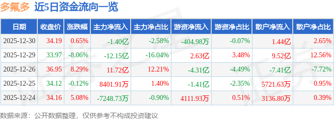 证券之星消息,截至2025年12月30日收盘,多氟多(002407)报收于34.19元,上涨0.65%,换手率14.95%,成交量161.59万手,成交额54.38亿元。