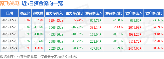 证券之星消息,截至2025年12月30日收盘,聚飞光电(300303)报收于6.87元,上涨0.73%,换手率2.45%,成交量32.59万手,成交额2.26亿元。
