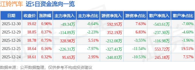 证券之星消息,截至2025年12月30日收盘,江铃汽车(000550)报收于19.02元,上涨0.9%,换手率0.79%,成交量4.07万手,成交额7768.37万元。