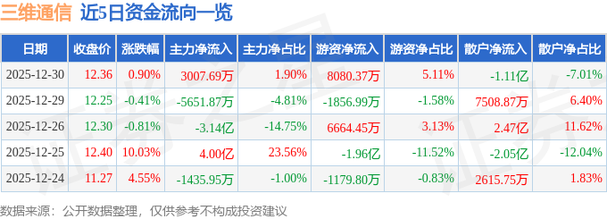 证券之星消息,截至2025年12月30日收盘,三维通信(002115)报收于12.36元,上涨0.9%,换手率16.98%,成交量127.71万手,成交额15.81亿元。