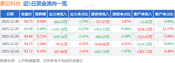 证券之星消息,截至2025年12月30日收盘,豪迈科技(002595)报收于84.75元,上涨0.94%,换手率0.25%,成交量2.0万手,成交额1.7亿元。