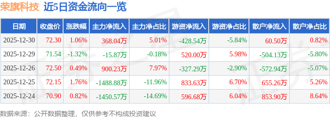 证券之星消息,截至2025年12月30日收盘,荣旗科技(301360)报收于72.3元,上涨1.06%,换手率4.04%,成交量1.03万手,成交额7343.94万元。