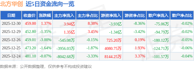 12月30日的资金流向数据方面,主力资金净流入3.94亿元,占总成交额8.38%,游资资金净流出3.93亿元,占总成交额8.36%,散户资金净流出75.06万元,占总成交额0.02%。