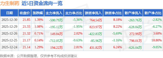 证券之星消息,截至2025年12月30日收盘,力生制药(002393)报收于21.85元,上涨1.39%,换手率1.71%,成交量4.3万手,成交额9350.42万元。
