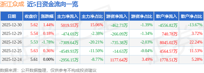 证券之星消息,截至2025年12月30日收盘,浙江众成(002522)报收于5.62元,上涨1.44%,换手率6.56%,成交量59.36万手,成交额3.33亿元。
