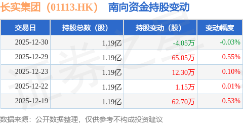 证券之星消息,12月30日南向资金减持4.05万股长实集团(01113.HK)。近5个交易日中,获南向资金增持的有4天,累计净增持137.15万股。近20个交易日中,获南向资金增持的有15天,累计净增持82.06万股。截至目前,南向资金持有长实集团(01113.HK)1.19亿股,占公司已发行普通股的3.4%。