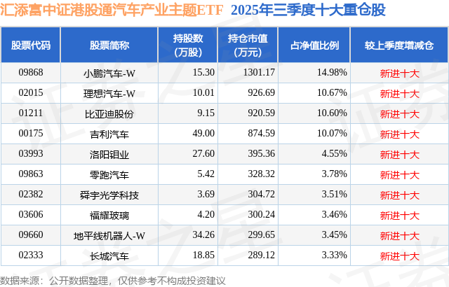 汇添富中证港股通汽车产业主题ETF基金成立于2025年5月22日,基金经理为董瑾 乐无穹,基金跟踪标的为中证港股通汽车产业主题指数,成立以来超额回报为3.11%,近一个月超额回报为-0.67%。最新披露的基金持仓数据显示,截止2025年9月30日,该基金第一大重仓股为小鹏汽车-W(09868),持股占比为14.98%。
