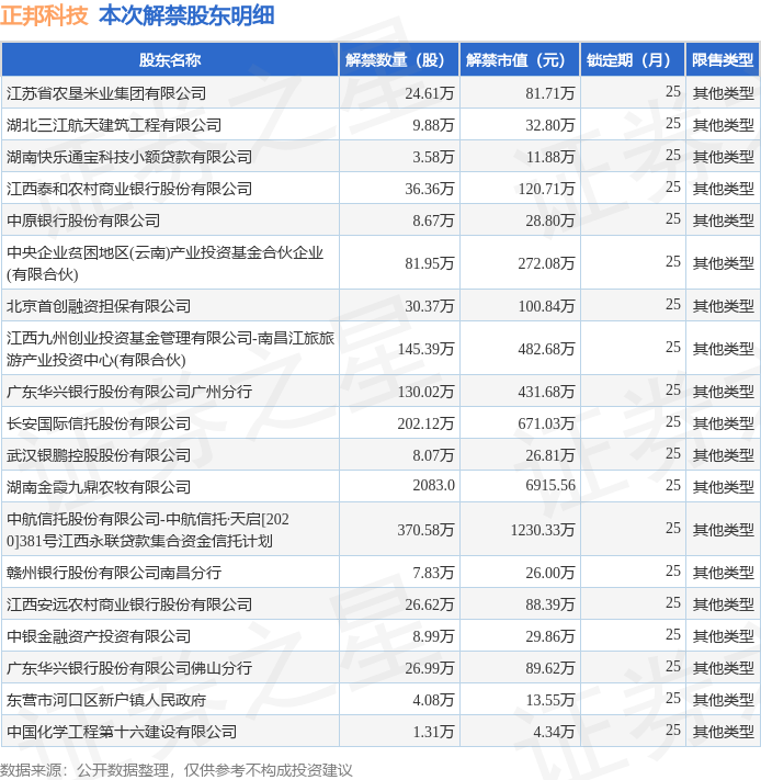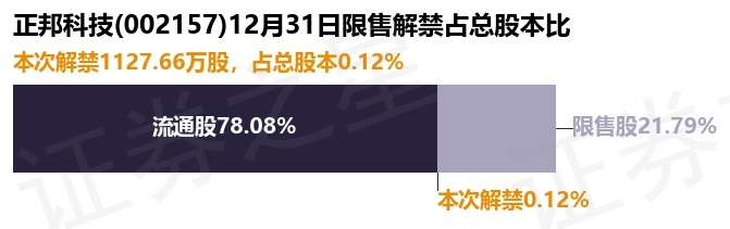 证券之星消息,根据市场公开信息整理,正邦科技(002157)于12月31日将有1127.66万股限售股份解禁,为公司其他类型,占公司总股本0.12%。(本次数据根据历史公告整理得出,实际情况以上市公司最新公告为准)最近一年内,该股累计解禁6721.5万股,占总股本的0.73%。本次解禁后,公司还有20.16亿股限售股份,占总股本21.79%。具体如下图所示: