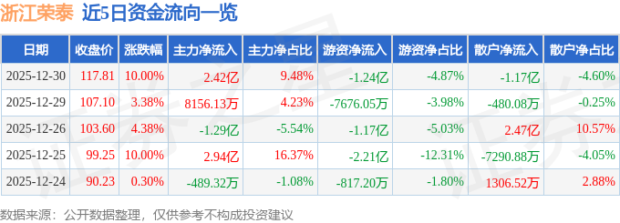 证券之星消息,截至2025年12月30日收盘,浙江荣泰(603119)报收于117.81元,上涨10.0%,涨停,换手率11.13%,成交量22.68万手,成交额25.5亿元。