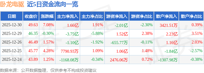 证券之星消息,截至2025年12月30日收盘,卧龙电驱(600580)报收于49.63元,上涨7.08%,换手率11.57%,成交量180.29万手,成交额87.16亿元。