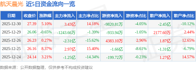 证券之星消息,截至2025年12月30日收盘,航天晨光(600501)报收于27.39元,上涨5.1%,换手率20.61%,成交量88.17万手,成交额24.22亿元。