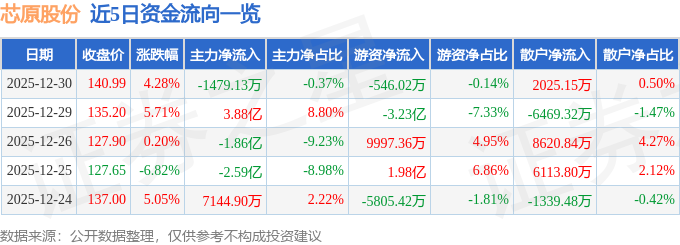证券之星消息,截至2025年12月30日收盘,芯原股份(688521)报收于140.99元,上涨4.28%,换手率5.44%,成交量28.59万手,成交额40.17亿元。