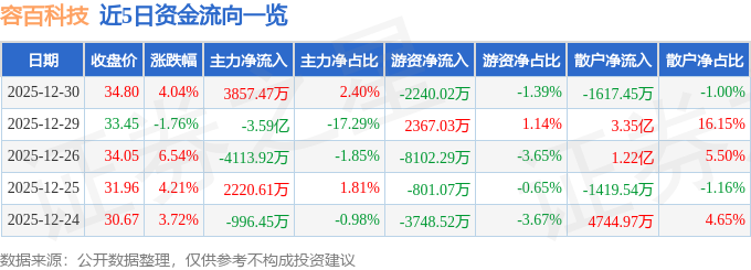 证券之星消息,截至2025年12月30日收盘,容百科技(688005)报收于34.8元,上涨4.04%,换手率6.63%,成交量47.35万手,成交额16.1亿元。