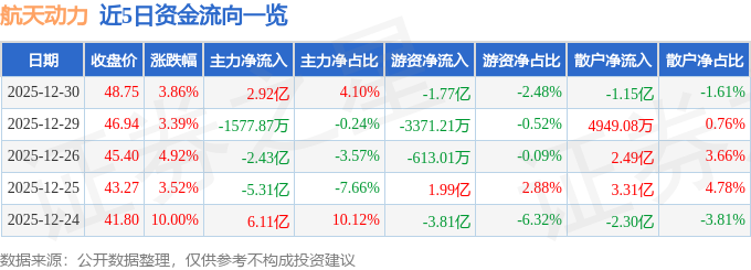 证券之星消息,截至2025年12月30日收盘,航天动力(600343)报收于48.75元,上涨3.86%,换手率23.67%,成交量151.08万手,成交额71.32亿元。