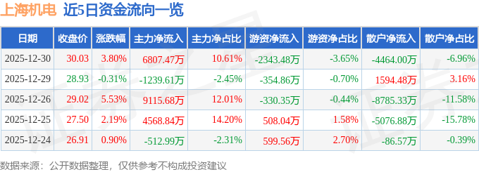证券之星消息,截至2025年12月30日收盘,上海机电(600835)报收于30.03元,上涨3.8%,换手率2.7%,成交量21.77万手,成交额6.41亿元。