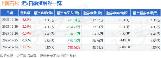 证券之星消息,截至2025年12月30日收盘,上海石化(600688)报收于2.85元,上涨3.64%,换手率1.93%,成交量141.2万手,成交额4.02亿元。