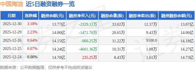 中国海油融资融券信息显示,融资方面,当日融资买入1.19亿元,融资偿还1.42亿元,融资净偿还2329.11万元。融券方面,融券卖出15.32万股,融券偿还2.95万股,融券余量33.02万股,融券余额985.98万元。融资融券余额13.87亿元。