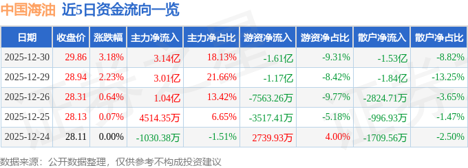 证券之星消息,截至2025年12月30日收盘,中国海油(600938)报收于29.86元,上涨3.18%,换手率1.96%,成交量58.5万手,成交额17.32亿元。