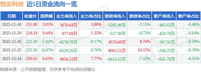 证券之星消息,截至2025年12月30日收盘,恒玄科技(688608)报收于231.0元,上涨3.01%,换手率2.65%,成交量4.46万手,成交额10.19亿元。