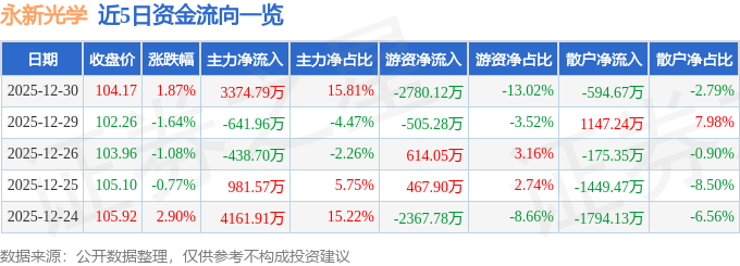 证券之星消息,截至2025年12月30日收盘,永新光学(603297)报收于104.17元,上涨1.87%,换手率1.85%,成交量2.05万手,成交额2.13亿元。