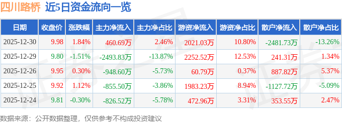 证券之星消息,截至2025年12月30日收盘,四川路桥(600039)报收于9.98元,上涨1.84%,换手率0.22%,成交量18.89万手,成交额1.87亿元。