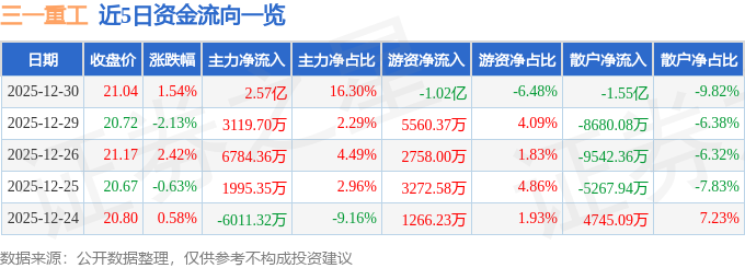 证券之星消息,截至2025年12月30日收盘,三一重工(600031)报收于21.04元,上涨1.54%,换手率0.89%,成交量75.04万手,成交额15.79亿元。